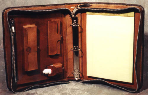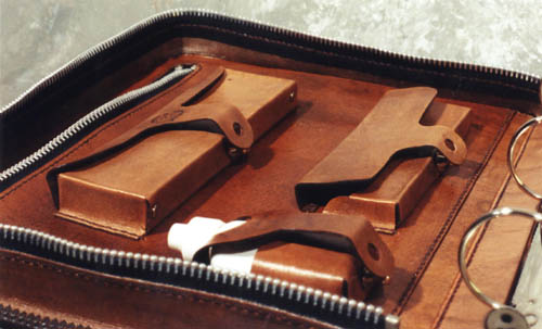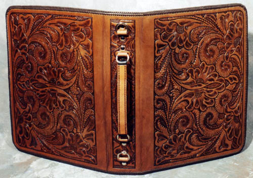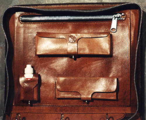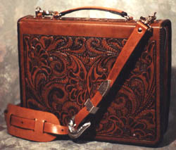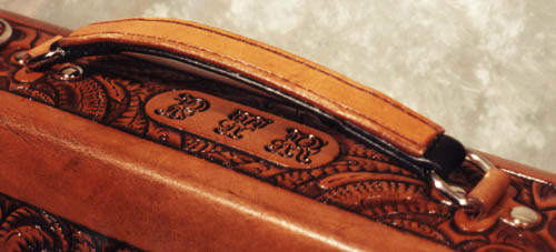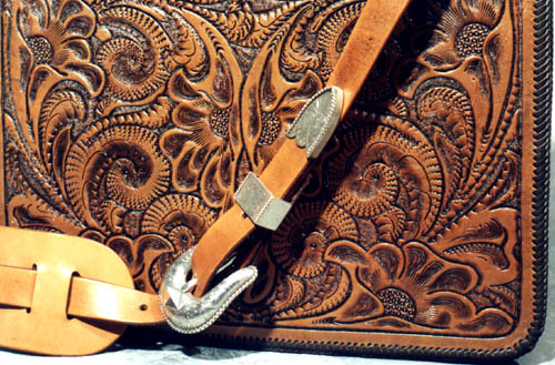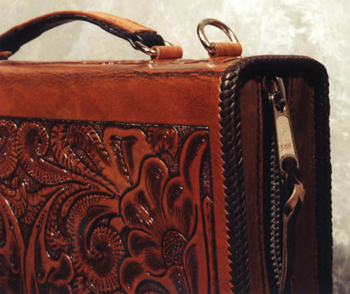 Everything is HAND done. Even the stitching of the zipper to the gusset is hand stitching. Lacing, of couse, is by hand (about 25 YARDS of the stuff!). And all the tooling (the most I've ever done on a single project) is all hand done, from a modified pattern in an old leathercraft manual I found in a used bookstore.