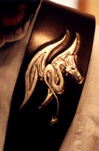 Dragon Guitar StrapThis guitar strap was a rush job for the birthday of the client's boyfriend. The dragon design was something the boyfriend had drawn which was inspired by a poster he had. I had to make some adjustments so that the line drawing would translate to leather, and I think it turned out well. On the back are his initials, of course. I wish there were a silver paint that went on smooth, with good opacity. The black dye tends to show through the silver paint unless you do like 5 coats. :(Price: $65+ |
