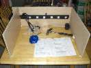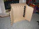 - With your power strip's cord hanging out the back of the cabinet, line up and nail down the cabinet's backing board. At this point, you have a shelfless cabinet with a power strip on one inside wall. I guess you could stop here if all your gadgets are really tall and thin, but most of mine were short and small, so I modded the shelves, too.