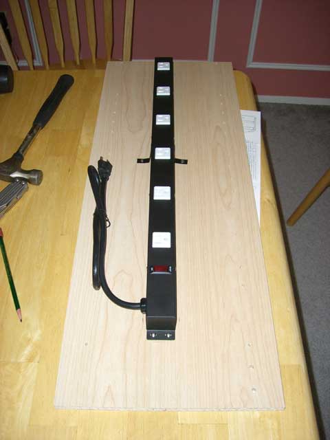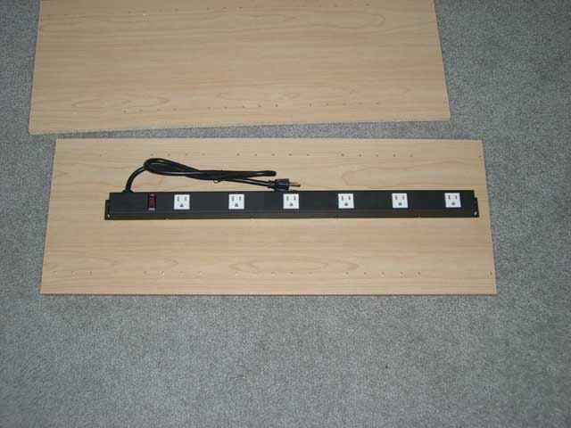 - I know it's hard sometimes, but your cabinet may be different than mine, so you'll want to be fully aware of the sequence of assembly and where all the parts are going BEFORE you start screwing things on. Without any hardware involved, I made sure that my power strip would have plenty of room on all sides so that there wouldn't be any problem assembling the cabinet. My original idea had the strip in the back of the side, but after seeing where the peg holes for the shelves are, and thinking about how some wall warts might need to be turned around, I decided to put the strip right in the middle of the side. You might need to choose a different location as well.