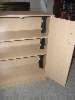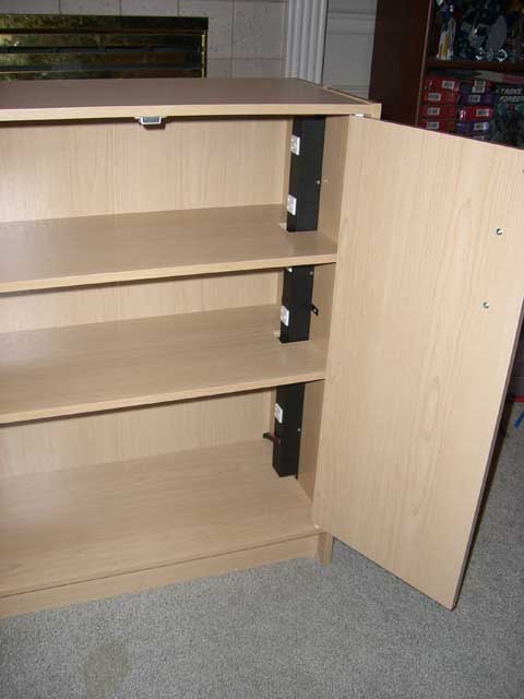 - Put the shelf down on the side where you'll be attaching the power strip, and line it up the same as it would be if it were on the pegs after being assembled. For my cabinet, the back of the shelf is flush with the back of the cabinet side, because the doors are flush with the face of the cabinet when closed, so the shelves are behind the face of the cabinet enough for the doors to be there.