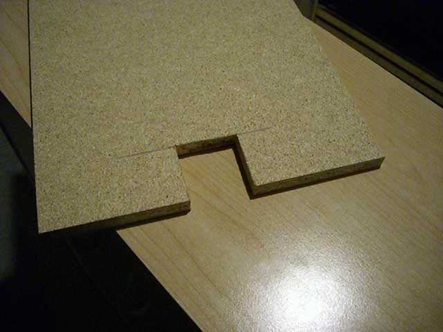- Trim away any splintered pressed wood from the end of the notch where it wasn't actually cut. The scoring on the top and bottom of the shelf should have resulted in a nice clean edge in those areas. The center doesn't matter, so we just clean it up and leave it at that.