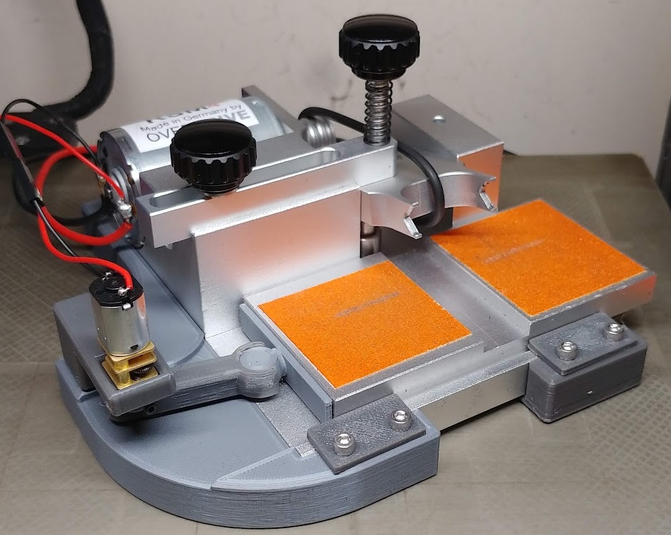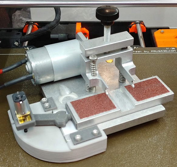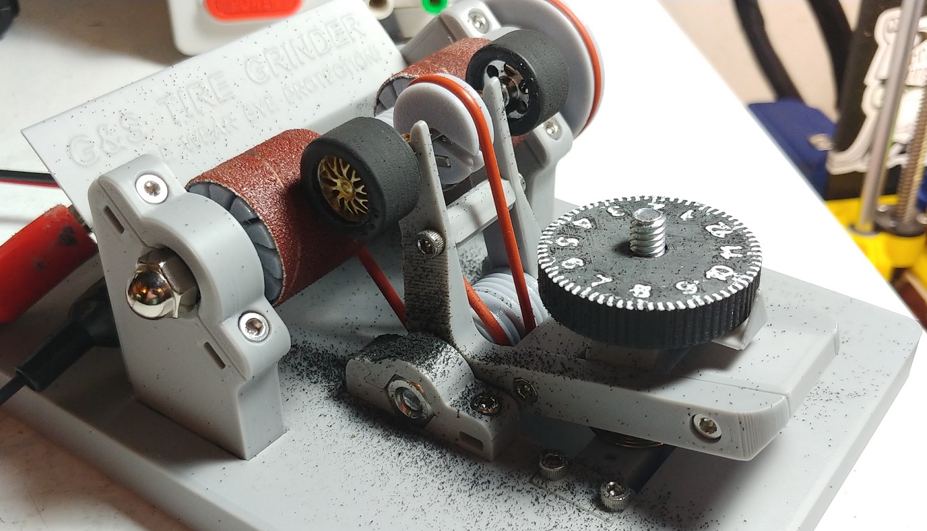 The G&S Tire Grinder is designed to be as versatile as possible. Standard 1/32 axle bushings snap into the axle bracket, while larger or smaller bushings will rest in the upper or lower v-goove. While this is designed as a beginner machine for whole axles with pressed on plastic wheels, it also works well for performance axles and metal wheels, allowing you to true one or two at a time. The sanding spindle can be easily adjusted for parallel (tramming) to the axle bracket, and spare plastic parts are included for those that are expected to wear over time, such as split pulleys (for both 3/32 and 3mm axles), motor drive pulley, and the axle bracket. Models for all parts are available for free online, and so can be printed by any 3d printer as needed.