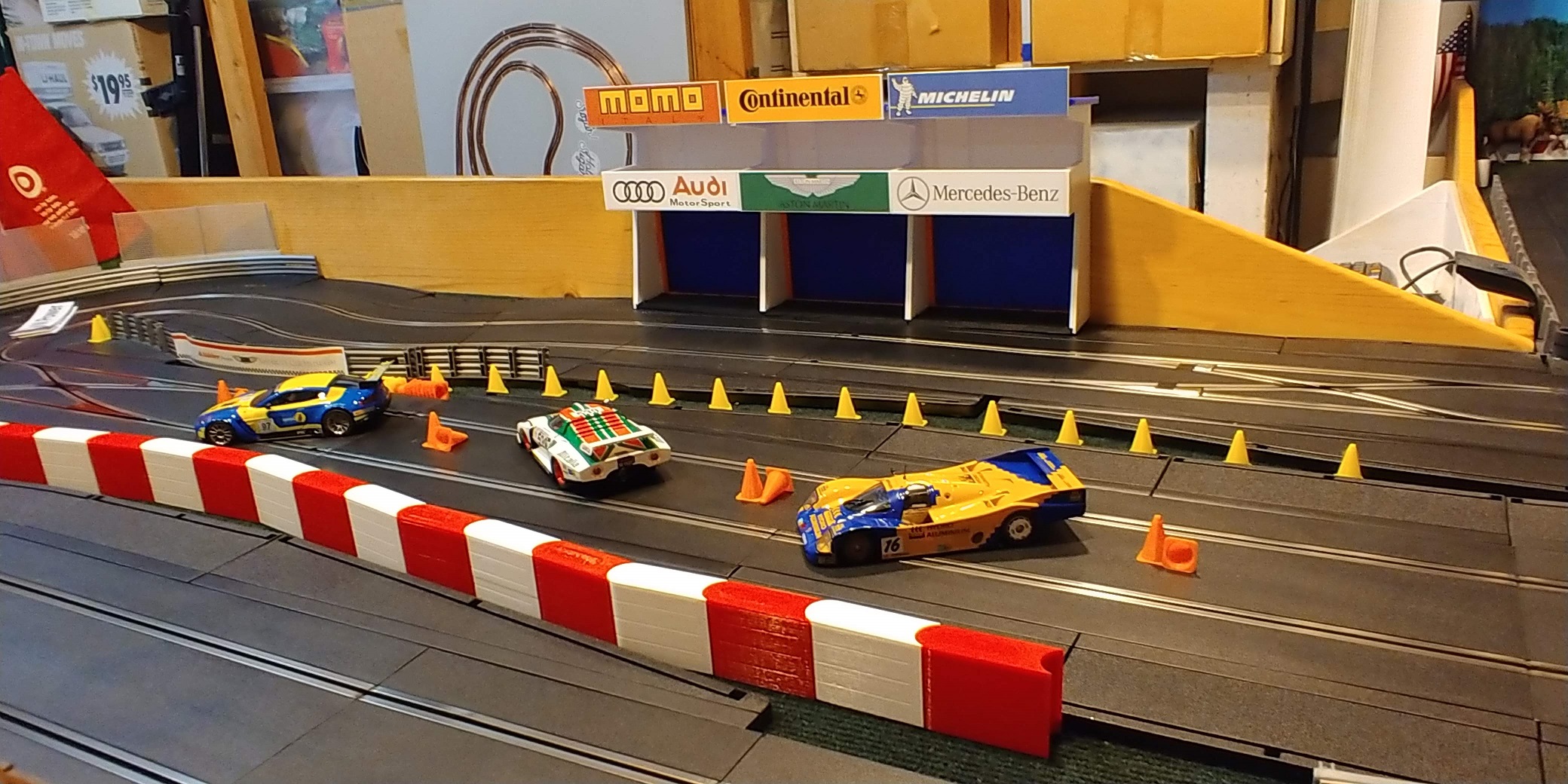 There is a very wide variety of models designed for slot car racing, from buildings to scenery to car bodies and chassis. Take a look at some of the things I've made for myself and other people. If you're looking for something in particular that you don't see on this page, just contact me. I might be able to find it, or design it. To the left you'll see A Dunlop bridge and lap tower, a Shell tower, pit lane garage facade, traffic cones, and more! Many of these come as simple model kits that you can easily assemble, or as ready to use completed prints. The PLA they are printed with can be painted, and they all pass the five foot rule. Some additional finishing work may be necessary if you plan to take close-up pictures, since the layer lines will be visible close up.