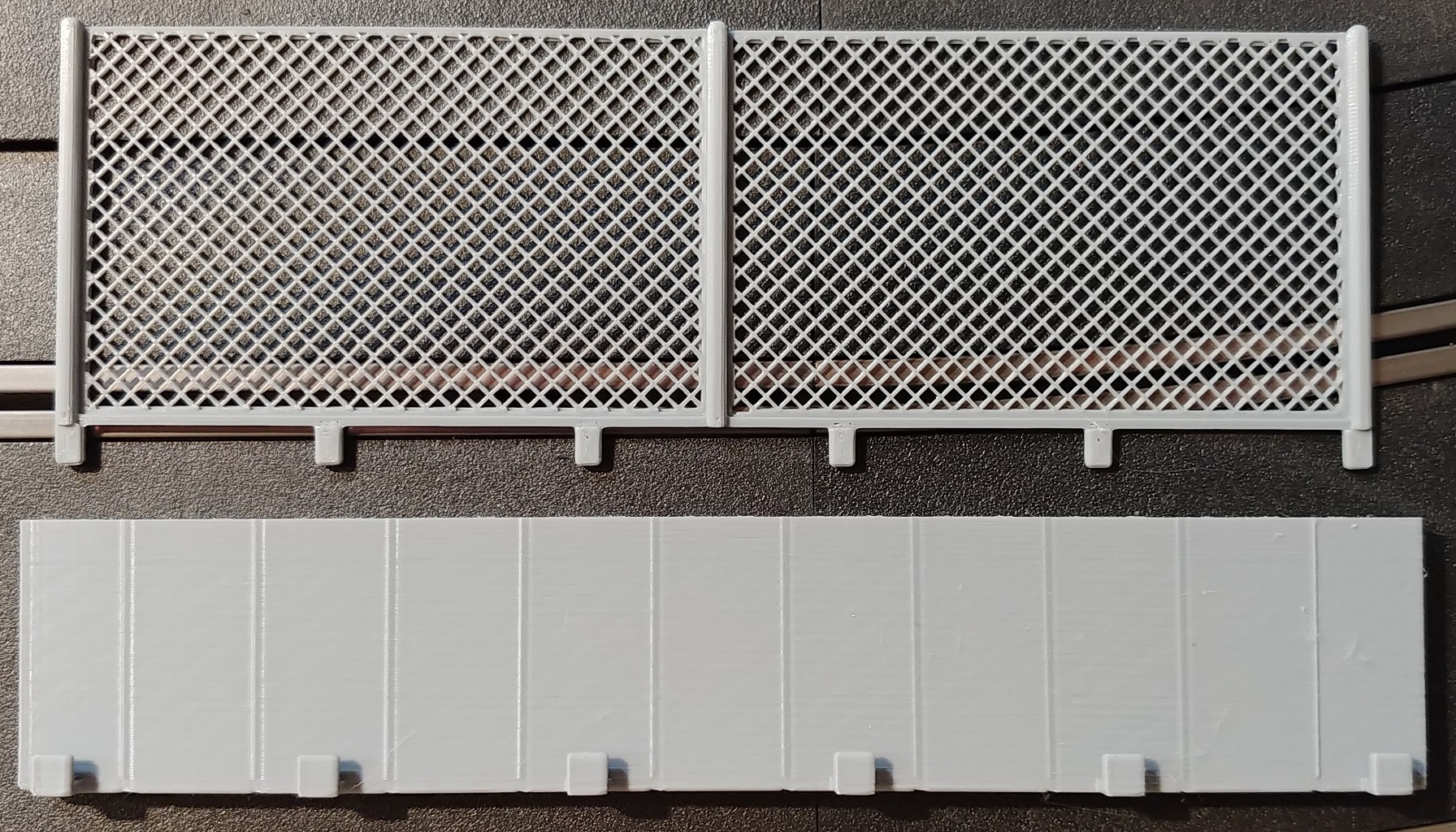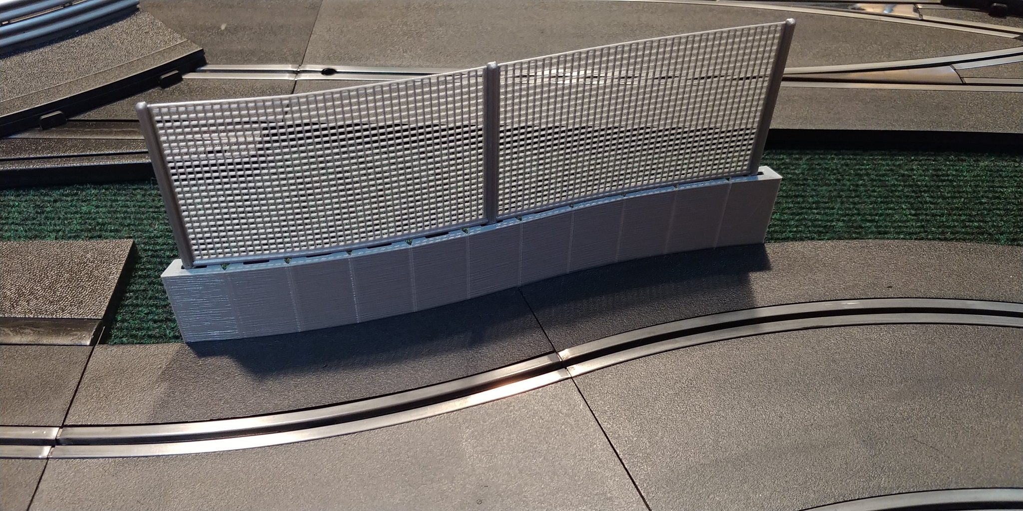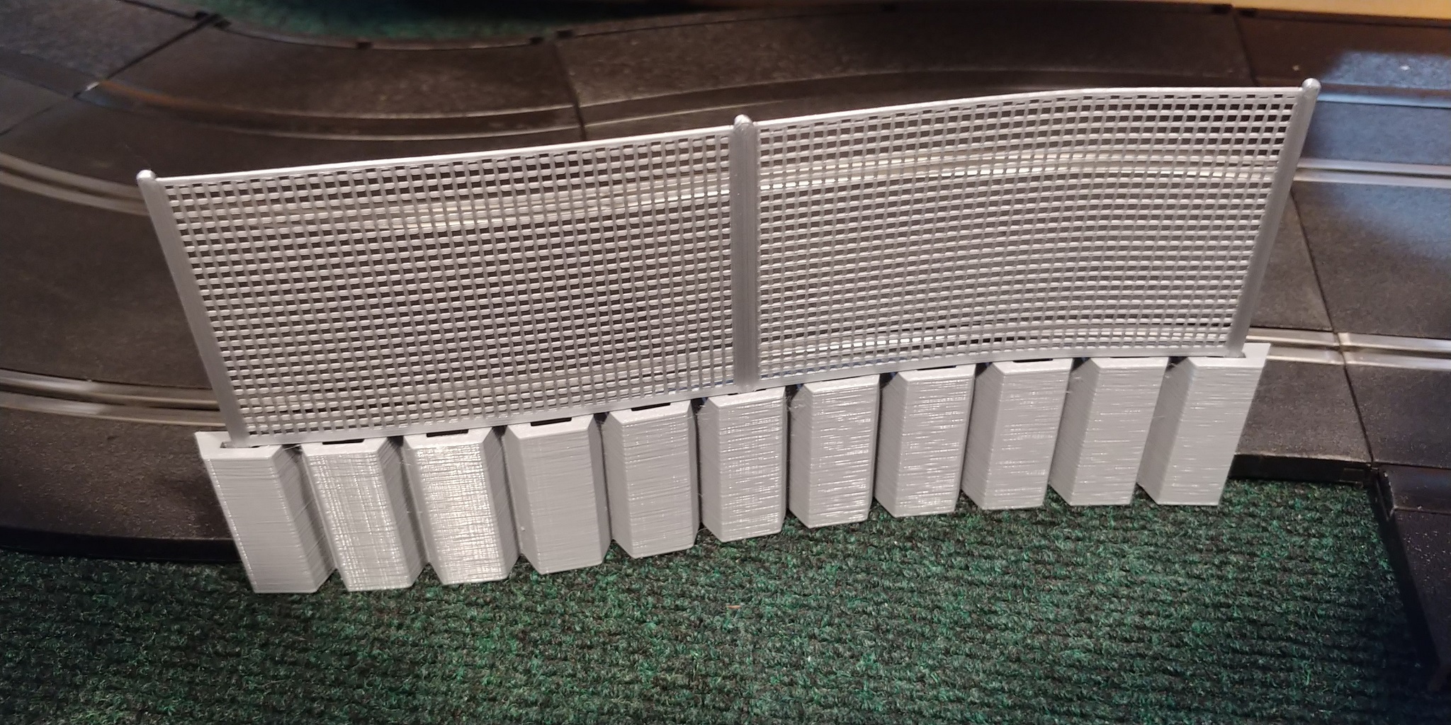 These crash barriers are a great looking way to help keep your cars on the track and your spectators safe. The fence can be printed with the "chain link" in any size and orientation. The wall can flex either direction, or both at once, and the fence can be installed offset any number of slots as you like. They can also be easily shortened by snapping or cutting the sections off. The Walls can connect to the edge of track or borders and has been tested on many different brands of track. If necessary, I can adjust the model for printing to ensure compatibility with other tracks/borders, with the appropriate measurements. While gray is the most common, both the wall and fence can be printed in any color. These are sold as a set of FOUR walls with fences.