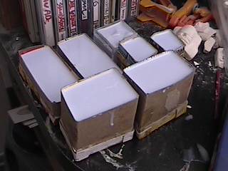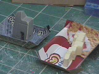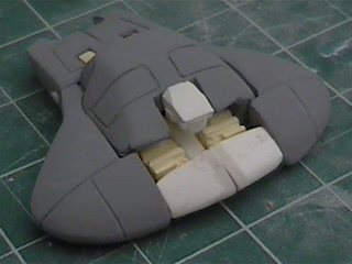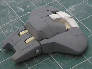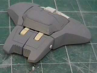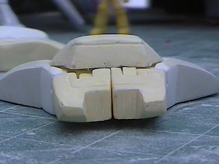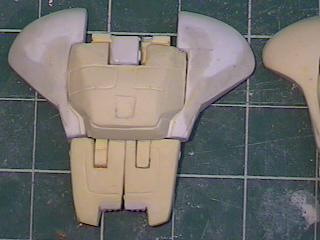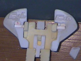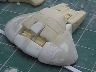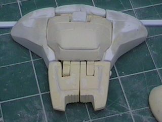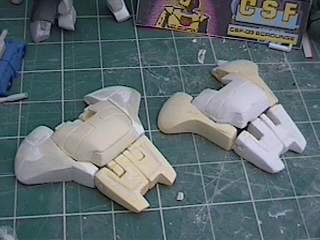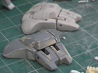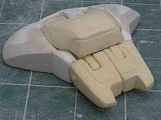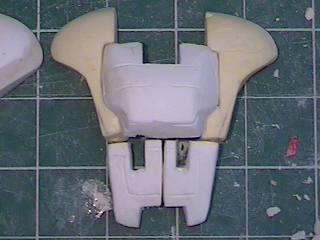 The step after making the clay prototype B00 was making testshots off it. I made molds of all the clay parts and then cast three complete copies in resin. These copies I named B01's. After they were made I destroyed the molds since I didn't need to make anymore exact copies of the original sculpey master. I took one B01 and further refined the form until the parts were nice and smooth and they lined up better. I changed the shape of the wings because the shoulders needed more reinforcement and the bulkier arms supported the internal shoulder mechanisms better. For a little while I considered molding a makeshift Cybcon logo into the undersides of the arms, but we decided against doing that. I primed the parts and sanded them down until they were nice and smooth and then I began making molds from this final resin master. Unlike a lot of resin casters out there, I don't use legos to make my mold boxes. I've found they leak too much. So I make my boxes from thin cardboard (like cereal boxes) and glue. I have more control over the shape of the molds that way. |