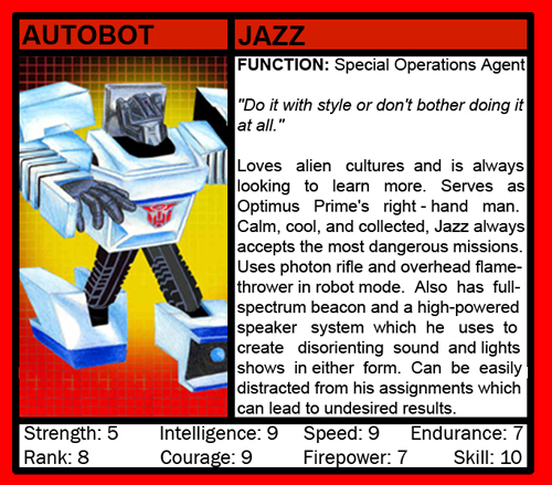 Weaknesses: Jazz can be distracted from his assignment if he encounters some new, alien behavior patterns that he finds interesting. This can sometimes lead to driving off a cliff to getting blasted by a Decepticon Skyraider.
