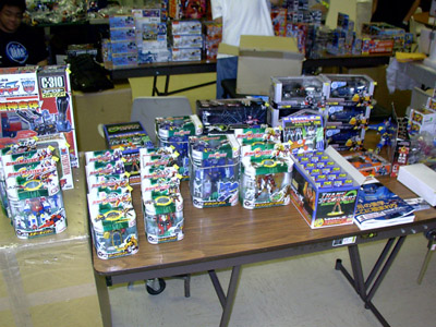 This year, we had a ton of prizes to be raffled off ranging from our exclusive, crazysteve-made Cybertronian mini bot Jazz to Armada Unicron to decoys to comics and so much more. Several items were raffled off every hour on the half hour. Returning this year were the contests we had from the previous CybCon shows. This year, the toy used for the transformation contest was G1 Scourge with toys donated by Joebot. The winner, Pat Nguyen, won a G1 Scourge along with reproduction labels to make it look new again. This was a lot of fun. Scourge is certainly a challenge in a time trial let me tell you. An hour later, at 2pm, was the trivia contest. After a gruelling tournament, Pat Nguyen once again emerged victorious, a CybCon Jazz as his prize. I wasn't present for most of the Beast Wars Transmetals tournament an hour later, but from what I hear it was just as tough as the other two contests. The winner was Stephen Day who walked away with a CybCon Jazz. Congratulations to everyone. After the last raffle of the day, we auctioned off a few items. A complete set of Stormsword jets went for over $90, a set of G2 Gobots went for over $60, and the last CybCon Jazz went for a whopping $115! I find these prices amazing. So, congratulations to the winners of the various auctions.