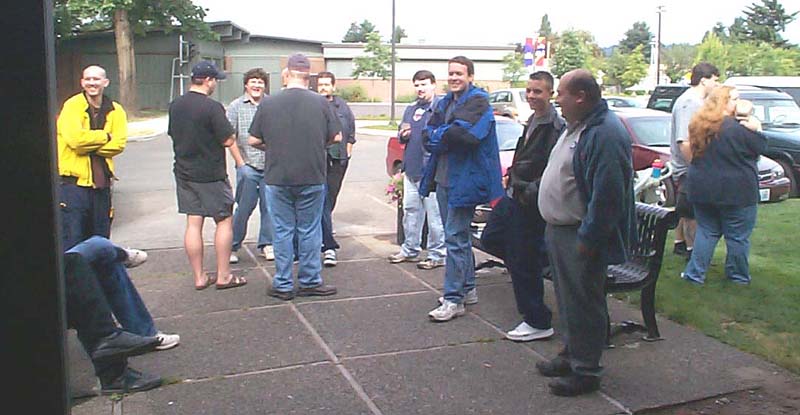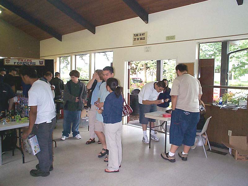Well, the day has come and gone. Reports have been written, and the cat has forgotten what the inside of the bag even looks like. But hey, I took pictures, and I took video (with Richard's generous assistance), so I figure I might as well tell my story, if only to toss in one more perspective, as an organizer, attendee, and oft-times ringmaster. For my part, aside from being the numb-skull that said "Hey, how's about everyone in the area come hang out with me for a day?" 5 years ago, I contributed where I could. Starting with the reservation of the building 6 months ago, through all the "Yeah! let's do that!" replies to Richard's communications with crazysteve about the exclusive toys, the endless requests for Richard to tweak this and that on every inch of every panel of the box designs to suit my perfectionist artistic eye, which he begrudgingly yet skillfully made happen with his Photoshop magic, the over 50 photo-quality prints my printer churned out for me to carefully (perfectionist, remember?) trim out, fold up, and encase 45 toys in, my work truly encompassed only a small portion of it all. Zobovor has detailed his beautiful work on the character art, battle scene, and instruction booklet. Crazysteve has detailed his mind-boggling work on the breathtaking custom Bumblebee toy. Richard has glossed over the work he did on the box design somewhat... when I said endless requests for tweaking the design, I wasn't kidding... he probably won't do a box with my knowledge again. ;-) All that work came seamlessly together to be one of the most memorable Transformers conventions for all that attended, and possibly the best CybCon for a very long time to come. So what was it like on the day of? Well, I can only tell my side, so here we go. Who can sleep well the night before a big meeting they're hosting? Well, not me anyway. I packed most everything the night before so that I wouldn't need to get up too early. Even though I set an early alarm to make sure I was ready to go and there on time, I was wide awake hours before my alarm was set to go off. I figure I might as well get up and get ready, if only so I wasn't feeling like I was in a rush. I had planned to be there at 8:30, half an hour before the dealers were to begin setting up, but even with stopping for doughnuts and bags of ice, I was there at about 8:15. Not at all surprisingly, there were already a few people there. If my feeble memory doesn't fail me, there were about 6 people there, 2 or 3 were dealers. I opened the building and took a quick look around to form a plan of action. It didn't take long for more people to show up, dealers and attendees alike. I put up an "arrival order" sheet for people to sign when they arrive, rather than making people (including dealers) stand in line the entire time. The early dealers helped me set up the (fortunately) numerous included tables into an island and tables around the perimeter for the other dealers to occupy. Fortunately, we didn't need many more tables, and the empty spots there were were promptly filled. Every dealer had a spot, and we even had a small area left over (more on that later). With all the tables in place, dealers could pick their spot and start setting up. Richard and his lovely wife, Zeatha, who was an indispensible helper for the entire time, arrived shortly after and helped with setting things up and bringing things in. Joebot arrived a little late this year due to an unfortunate fight with food poisoning, so several of us helped him bring his stuff into the room so he could set up a little faster. Richard set up a table with my old 10 gallon fish tank turned over on top of a tiered shelf showing off past CybCon toys, this years toys and prototypes, as well as some other rare and delicate items, including my BotCon 2004 breakfast exclusive Breakdown. He also set out some of his newer TFs like Shockblast, Cliffjumper, Binaltech Hound, and test-shot Towline. I set up my tables blocking off the kitchen area and put on them my TV and PS2 for video games (starting with the PS2 Transformers game for people to play with), the raffle and auction items, and the sign up sheets for the Trivia and Beast Wars Transmetals game tournament. This was also the ill chosen setup for delivering pizza to hungry people at lunch time.... but I'll talk about that later. :\ Shortly before 10am I announced to the dealers that they needed to go get in line if they wanted an exclusive. The sign in sheet had done its work, and the dealers were able to take their place according to their arrival time. I made sure everyone was lined up, and that anyone who didn't register was waiting at the end of the line. Such is their punishment! hehe. Anyway, I opened the doors promptly at 10, and Zeatha was immediately put to work. To speed things up, and because I was an idiot who forgot to get change for the people who inevitably had only 20s and 50s so people ended up buying a ton of raffle tickets (price reduced to 2 tickets for a dollar!), Richard came over to help her pass out the toys as they were sold, and to count off raffle tickets. Fortunately, another dealer has a few bucks in change to help us along, but I think most people decided to go ahead and get their "change" in raffle tickets anyway. I kept an eye on Joebot's table, which was still being set up, as he was in line for a little longer than the other dealers. It didn't take long for things to be in full swing, with the building, effectively the dealer room, being full of busy collectors looking for their next deal. It was also not long before everyone waiting outside came in and decided to buy toys or not. What surprised me was that there were actually TWO Bumblebee toys left over! I took the opportunity to do what we had originally planned to snag them for auction and raffle. As I approached Zeatha at the sign-in table, someone came up to buy one of them, so I only got one, and decided to put it with the Auction items. 11am rolled around, 
