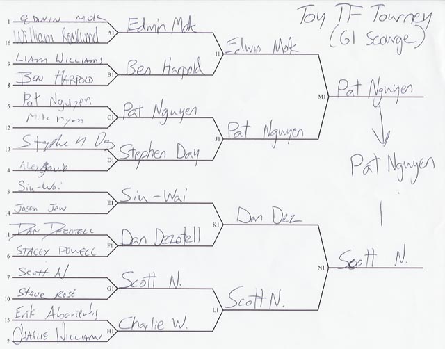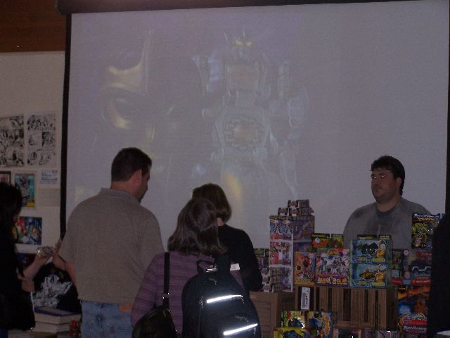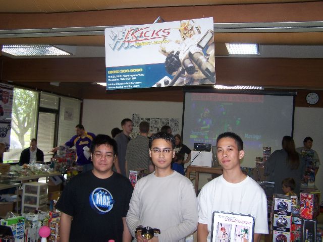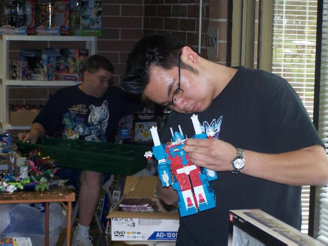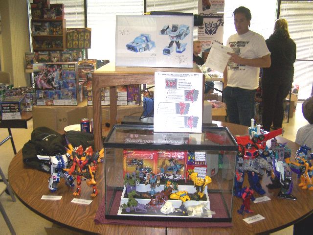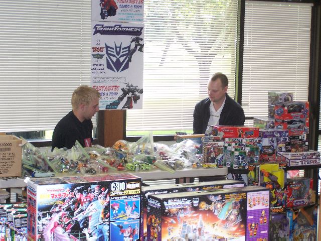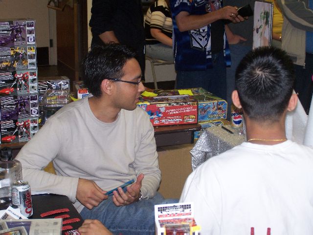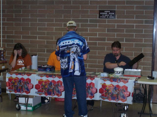 Shortly before the last few rounds of the BW:TM tourney, we did the Survey raffle. A large container held all the surveys, and Richard's lovely wife Zeatha pulled a random sheet from the box for the winner of another CybCon Jazz. You'd think we had a ton of them this year, but we didn't. Just 15 total to give away, though we did hold one aside for auction. After that was taken care of, we finished off the BW:TM tourney, and dove immediately into the final raffle and auctions. This was when handed out most of the Jazz toys, the Energon toys, and a slew of things I don't even remember. We literally had more and more things as the day wore on because generous dealers kept donating things! We also had several no-shows, and raffled off the extra SWAG bags, which included their own tickets for the winners to make use of. As it was getting toward the end of the day, we tried hard to move quickly, which can be difficult when half the tickets you pull are unclaimed. For the Jazz toys, I literally just kept pulling tickets and calling out numbers until all had been rightfully claimed. :) Finally, with all the raffle items gone, we dove into the Auctions. Up for auction this year were some interesting, and some desireable items. Of course, we had a single, the last, CybCon Jazz toy. After some very heated bidding, Kevin Hurd won it for $115. Always willing to help keep CybCon going, Kevin is a true fan if there is such a thing. We also auctioned the set of Jazz molds (minus key parts so you can't actually make any more) that were used to create the toy. There wasn't as much interest in these, but they did bring in I think about $20. We had a set of G2 Gobot recolors, including Optimus Prime, Soundwave, Ironhide, Frenzy and the rest that went for $61 to a bidder who desperately wanted at least one or two from the lot. We also had a bag of decoys, to which a dealer donated not only a decoy style Soundwave eraser, but also a genuine Ravage decoy! The set was drooled over a little more after that, but had only a couple interested bidders, and went for about $20 as well (I don't remember exact figures on most of these, so estimate some of them). And finally, we had decided, apparently mistakenly, to put a very good condition Wheelie minibot up for auction rather than raffle. I expected there to be a LITTLE more interest, but hey, everyone can make a mistake. I think he finally went for like $4, after having the starting bid lowered to $1. Poor guy. The toy really doesn't deserve the character's show deptiction. :\ By the time the auction was complete, we were looking around the corner of 4pm, nearing the end of the show. Attendance thinned out considerably, and a couple dealers even started packing up early. By the time 5pm rolled up on us, dealers were all started packing up and getting ready to go. Dealers finished up, we cleaned up, and helped Joebot haul his boxes and display stuff out of the building for him to pack into his van. He's always got so much stuff, the hour we provide isn't quite enough. :) Overall, I honestly don't think it could have gone much better. It was a great day, and I had a lot of fun, even though I didn't have much time to shop or buy. I did fill one small hole in my collection when I picked up a HOC Megatron with Mace. The next day I gave in and bought Cybertron Starscream at Wal*Mart. Man that thing is big! Anyway... We've got some survey's to look through, and plans to make for CybCon 2006. See you next year! -Greg |