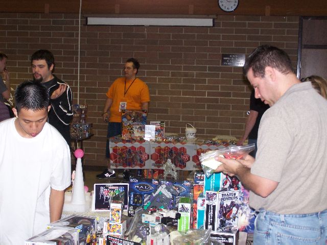 Wow. What a week. I'm such a slacker, that most of the work involved in getting ready for CybCon 2005 took place in the week prior to that Saturday. Most of that work, for me, was putting the C-Bots into their packaging, putting the Jazzes into their packaging, finishing up the booklet, and getting all the stuff into 80 SWAG bags. I won't pretend that my work could hold a candle to everything crazysteve did with his, again, amazing work on our limited exclusive toy. Richard spent a lot of time on the C-Bot and Jazz packaging, but I wasn't being nitpicky this year, given the amount of time we had left. Jackpot and Allen G. both did some beautiful work for the character art. Jackpot's depiction of C-Bot alone is enough to make you want the toy, even if it's just a silly promotional freebie with a new sticker on it. ;-) Joebot contributed most of the C-Bots themselves, and Steve Kincade was our official camera man, survey maker, and creator of the new CybCon logo as seen above, and on the products this year. I was so busy on Friday that I completely forgot to order the pizza until like midnight. Good thing Domino's was still open. :) By Saturday, we were ready to go, remarkably enough. Up early 'cus it was hard to sleep, I packed up and did some last minute preparations. On my way to the show, I did my usual stop at the grocery store for doughnuts and ice. By the time I arrived at the building, over half an hour before the dealers could go in, people were already there chatting with each other. Funny thing was that these weren't dealers, so they weren't getting in for over 90 minutes. I said, "It's not first come first served this year, you didn't need to come so early." They told me it had already become a tradition, and that one guy was there like an hour or more before then. Nut cases, all of them. But we still love you! ;-) Larry, the gentleman who was there to unlock, watch over us, and lock up when we were done, came a few minutes later. I followed him in and took the "tour" of the facility where he showed me the fridge and stuff, and had me sign some papers. By the time were were done, Richard and his wife Zaetha were there, and we opened up the doors for them and the dealers that were arriving. Unfortunately, due to a shortage of supplied tables at the facility, I had to put out and APB to the dealers to bring tables if they had them. So the first thing we had to do was take stock of all the tables we had, and see how well our layout would work given the available tables. Fortunately, with dealers bringing tables for themselves, an extra table or two here and there, and the few that were supplied by the facility, we had enough for our floor plan, and dealers began setting up. We even managed to come up with an extra table for someone who was hoping to get a last minute spot. Dealer setup continued at a fair pace, and we had ample time to get set up. Only Joeboy was finishing up when it was time to let people in. I closed the divider to the room so that only the door was available for entry, then went to the building entry and explained to people how it would work. Many people had pre-paid, so needed only to have their name checked off. Others paid at the door, but all had pre-registered. Zaetha did a great job checking people's names and handing out the SWAG bags. This year, instead of having people pay for every little thing individually, we asked for an entry fee, and then they just got everything... almost. The SWAG (Stuff We All Get) bags were actually Transformers Energon b-day party goodie bags. They were the perfect size to hold the 5.5x8.5" CybCon 2005 booklet, a toy, and a couple raffle tickets. This year the toy in the bag was a character we called simply, "C-Bot." This was one of those alphabet transforming promotional toys. We put a color coordinated CybCon logo sticker on all of them, created a character for him, and Jackpot made some GREAT art based on the toy and the character profile. Unfortunately, we didn't have enough C-Bots to supply all the registered attendees, and we filled out the rest with the Autocon toy, which was one of three of a set of recolored Energon Air Defense minicons recolored in translucent red plastic with blue/purple accents. Combined, they are called the Stormsword, and were available only at Dairyland Transfans, Dutchbot Con, and CybCon. The other Official CybCon toy this year, in VERY limited quantity of 15 units, was another crazysteve creation, Cybertronian Jazz in Minibot size. The toy looks fantastic in both modes, and fully transforms using the minibot transformation styles of Cliffjumper et al. Attendees and dealers were also given a survey to fill out, so that we can make CybCon better in the future... with the incentive of a raffle prize to a lucky survey filler-outer. It didn't take long at all for people to begin filling the room and making deals for their favorite toys. With raffles happening every hour, half past the hour this year, it was pretty busy for me. By the time I managed to walk around the room once, I was back at the CybCon table to start another raffle. We had some technical difficulties with the PA system at first, but finally managed to get it working. It was nice to be able to talk normally into a mic rather than shouting at the entire room. :) We had so much raffle stuff, that we ended up giving two and three things away each time, and at the end of the day we still had like 10 things to get rid of. We also decided to have an auction to try to recoup some costs, as the $5 entry was not enough to cover all our expenses. During the morning, we didn't have any activities other than the hourly raffles planned, so people simply checked out the dealers' wares, chatted, and hoped their number was called when the raffled happened. We had the first raffle a little late at about 10:40, then the second around 11:30, each time giving away a Throttlebot or two, and a couple other nifty bits. Noon came quickly, and the pizza w