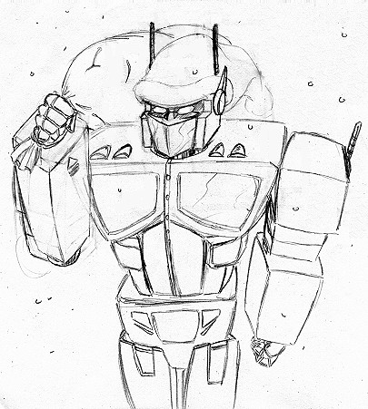 - Optimus-Dazed - This is a sketch, in the very beginnings, but none the less a work. Optimus is depicted here as being in a daze, a state of immense thought. (91k, 12-1-00)
