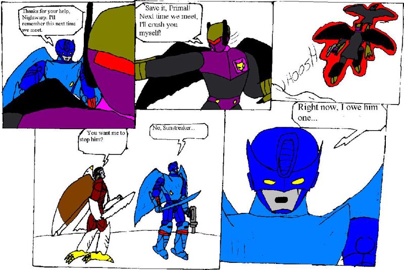 - "BW Sunstreaker" - Well, since there's a Fuzor SIlverbolt and he's so popular, I figured I'd change the Magnaboss Silverbolt's name instead. Sunstreaker seemed like an interesting character and the name fit an eagle rather well, so I chose him. I'm not entirely pleased with this rendition so I might redo it sometime in the future. (36k, 7-5-00)