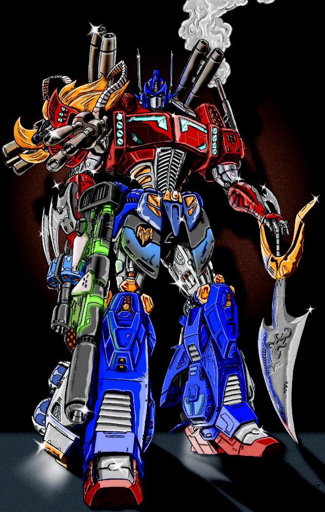 - Ultra Optimus - Commisioned art. Ultra Op is an amalgum of Star Saber, PowerMaster Optimus Prime, and Leo Convoy (BWII). Instead of two tires on each leg, he's got extra grenade drums for his rifle! }-> (112k, 9-26-00)