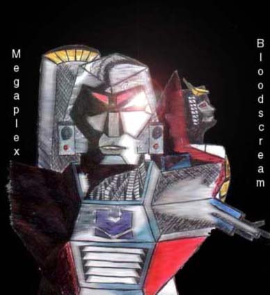 - Megaplex - This is a pencil drawing (of my own creation) that I inked and colored with color pencils. I then scanned it and edited in photoshop. Megaplex is the main focus of the pic. Megaples is a gestalt comprised of Megatron, Galvatron, and Shadowplex (in my fan fic universe), and to the right is Bloodscream, Megaplex's right hand 'bot. (30k, 1-1-01)