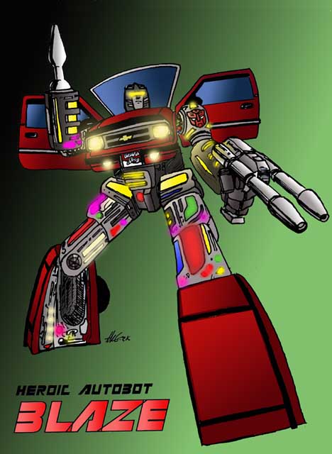 - "Autobot Blaze, Colored" - Pen and Ink + Adobe Photoshop, drawn circa 2001? I also colored the piece for him and gave to him as a gift. I absolutely love Adobe Photoshop and wished I had the time to do more coloring there. This is my first attempt to ever color one of my B/W illustrations (47k, 7-31-04)