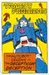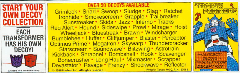 DecoysThis is the tiny little flyer that promoted the existence of the Decoys that came with the Minibots during one of the promotional things, similar to the "minispies" promotion. Basically, it's a little comics strip that makes you want them all, and a list of all the ones to try to collect. Approximate dimensions are 2" by 6-3/8" |