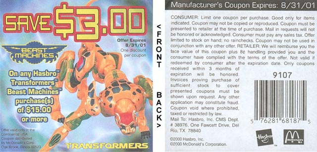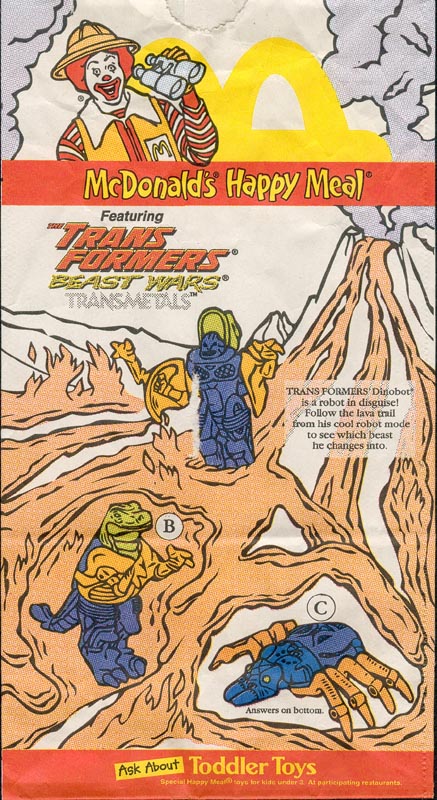 Beast Wars Happy MealThis is the second Beast Wars McDonald's promotion, promoting the Beast Wars Transmetals toys, which took place in 1998. Instead of boxes, this time we got bags. :( The co-promotion was "My Little Pony" which was on the back of the bags. One side of each bag had coupons for either toy line, and the other side had an extension of one of the "activities."