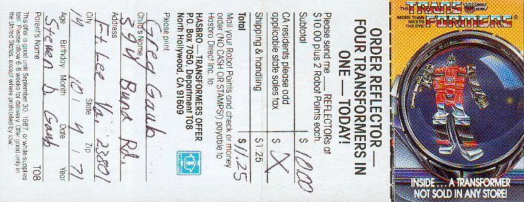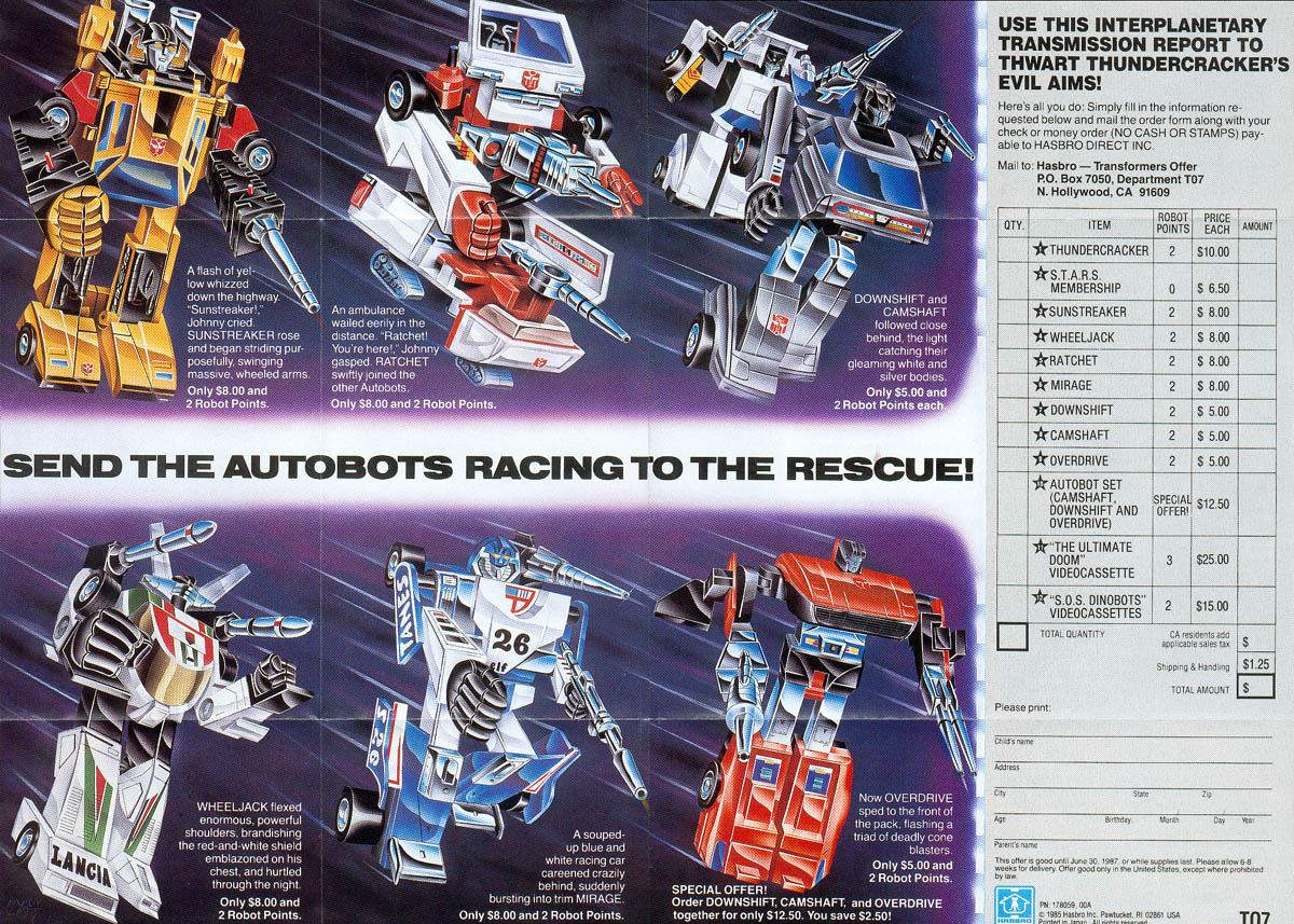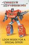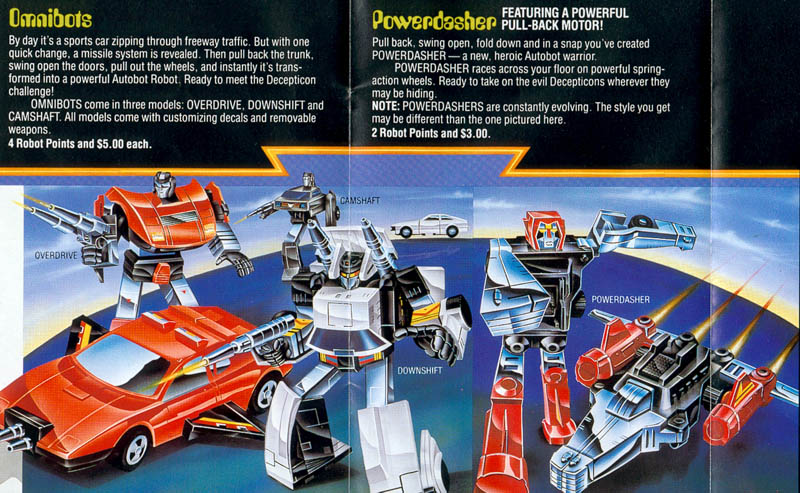 OmnibotsSimilar to the Reflector flyer, this one promotes only the Omnibots: Camshaft, Overdrive, and Downshit. Also with description and order form. Approximate dimensions are 2" by 5" |