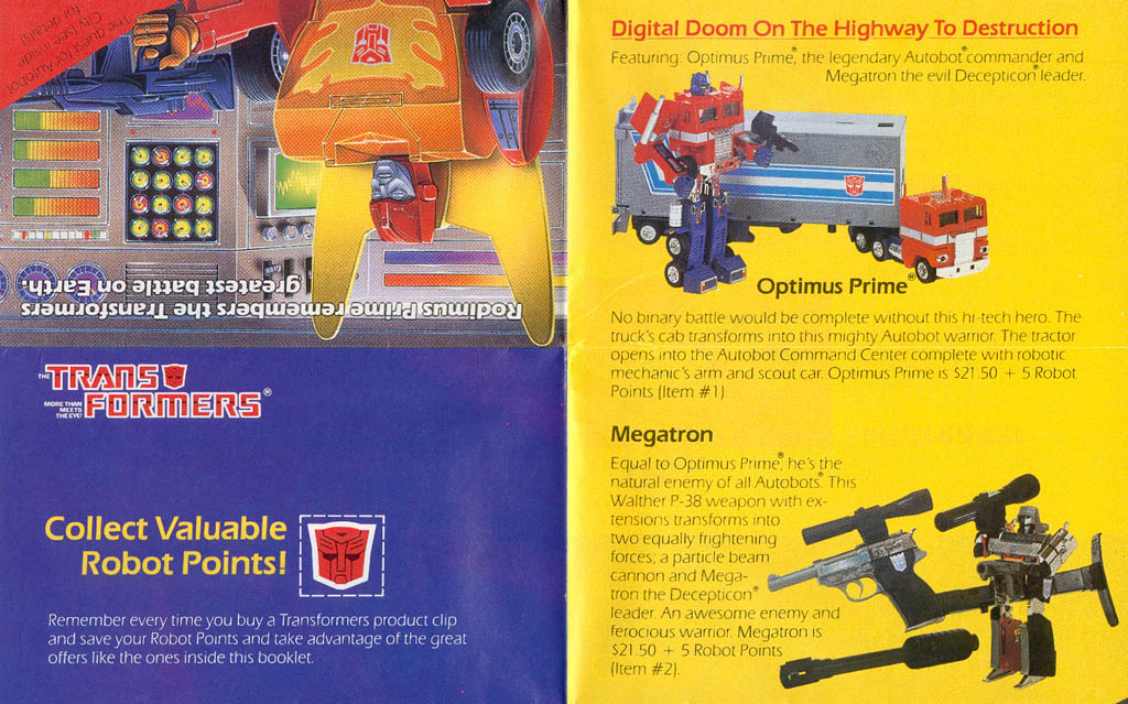 The Quest for Autobot CityThe pages of this flyer aren't really numbered, so I'm just kind of guessing. Approximate dimensions of each page are 11" by 7". This happens to be the promotion that I got my Thundercracker, Reflector, Wheeljack, and Cosmos toys from. I also got Ratchet, which I later traded, and I tried to get Optimus and Megatron, but they were out of stock. |