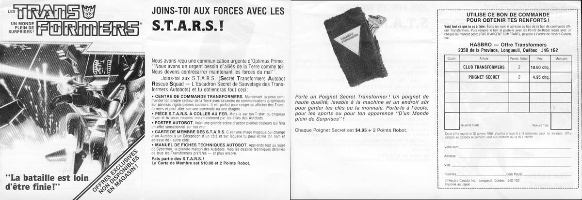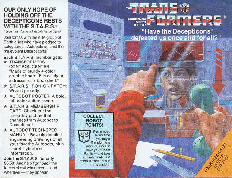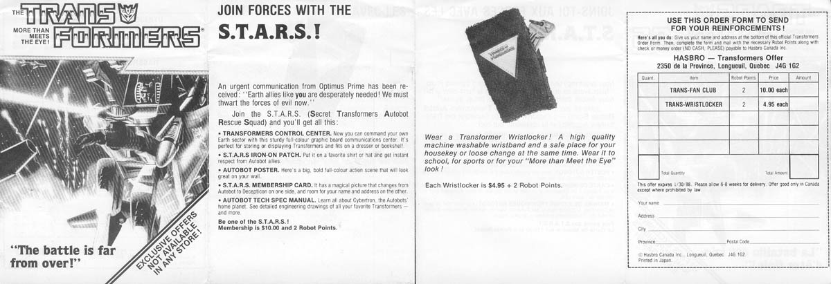 S.T.A.R.S. #1One of the many flyers promoting the S.T.A.R.S. (Secret Transformers Autobot Rescue Squad) TF fan club. The club is basically some TF stuff: STARS iron-on patch, card, poster, tech-sepcs manual, and a "command center" (posterboard thing of some kind). This flyer also sells a "wristlocker" and comes a two-sided flyer... one side in English, one in French. Approximate dimensions are 5-1/2" by 16" when fully opened. |