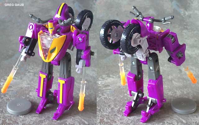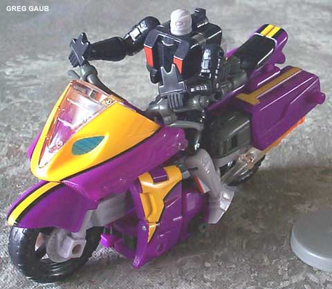 | Added by: FAB1 on March 27, 2003 Rated it: Comments: A solid TEN! Why? First: Even my darling Transformers-hating best gal thinks he´s cool - because of the color scheme. 2nd: In Robot Mode he looks a little like the old DIACLONE MICRORIDER model kit by REVELL. 3rd: The combined Crossways/Rook/Robot rides that thing most naturally - like a young Marlon Brando 4th: He´s the FIRST TF motorcycle that comes with a rider. 5th: He combines LOTS of gimmicks old and new: The rocket launcher stems from the G2 Minijets, his Minicons COMBINE(!!), they are his HEADMASTERS and those sliding panels revealing either Decep´or ´bot insignia are a stroke of genius. 6th: If pushed forward straight and fast enough he rolls for an amazing distance 7th: His Minicons feature AMAZING articulation so their legs can be bent behind the robot´s head in either ´bot or ´con mode. 8th: Transformation is fairly easy and still complex enough so you don´t see too many robot parts when he´s in vehicle mode. 9th: I´m still a sucker for clear plastic parts - and that way the exhaust pipes/missiles look great. 10th: You can even place BOTH minicons behind each other on sideways´ vehicle mode. THAT`S WHY! The robot´s limited posability can be ignored totally - I want a transforming toy - not a POSEUR! ;-) |