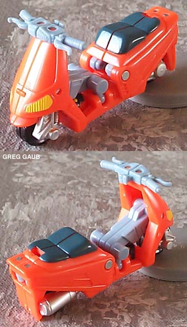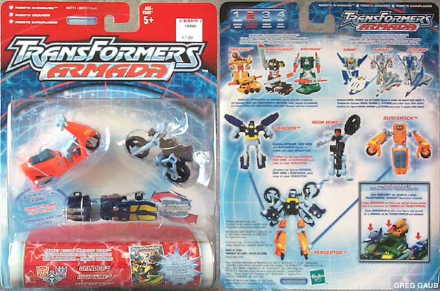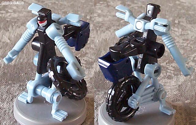 Toy Review: Quirky. That's what these guys are. Their cartoon depictions aside, I like them. Grindor has a great robot mode, even if a "rocket powered skateboard" is a little off the wall. I had a moped when I was in college, so I really like SureShock, even though his robot mode is just plain lame. High Wire is the homeliest of the bunch. His bike mode looks OK, but his robot mode is just pathetic. As little more than the head for Perceptor, the combined form of these three Minicons, he might as well not exist. I like a robot with wheels on his shoulders as much as the next guy, but I think without High Wire and an extra head on Grindor somewhere, Perceptor would have been just as good. Now that I've mentioned Perceptor, he's not a bad robot. He looks as cool as Grindor does, and by virtue much cooler than High Wire and SureShock. He's not real posable or anything, as parts of him get in the way of other parts. Honestly, the only reason to get this set is for Grindor, and because it's a combiner. Perceptor in the show kick tailpipe, so it's neat to have this character in toy form. I like it, so I recommend it.