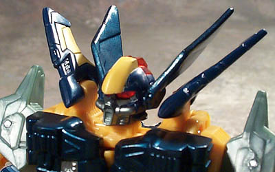 - He's a nice dark-blue, with yellow and red accents. His "energy burst" missiles are translucent red, and he's got some silver/grey bits. Overall, a very nice scheme.