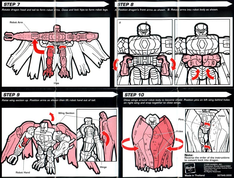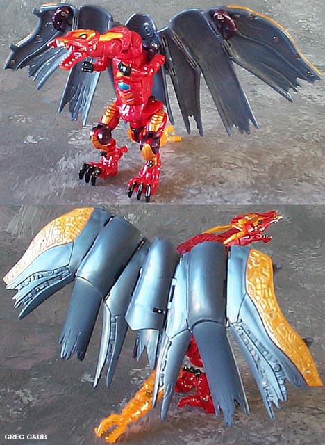 - I have to give them points for this one. It's fairly ingenious... though they all are. ;-) His "wings" come together nicely for the cloak, and his robot/beast conversion is simple but effective.