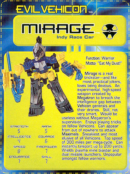 - Billed as an "Indy Race Car" one wonders what a Cybertronian vehicle has to do with the Indianapolis 500? Anyhow, he's a pretty cool, batmobile-esque race car, with huge spoilers and large blue exhaust pipes (which become his missiles). Covered in techno-accents, with a gun in the "cockpit", this one's a winner!