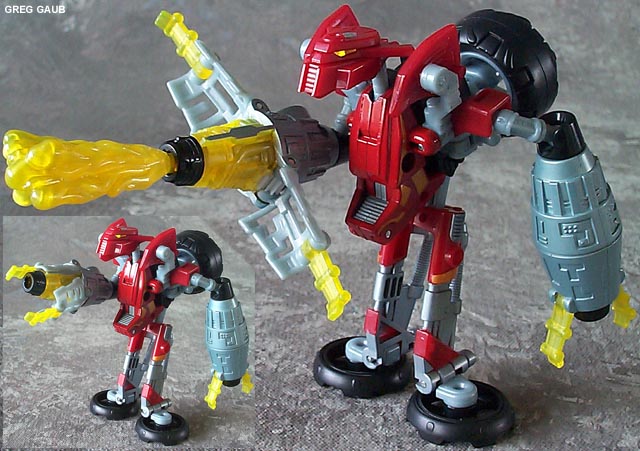 - A very nice combination of gray, red, and yellow, with some black parts (tires! ;-). He also has translucent yellow claws/pincers for his hands, and his projectiles are the same kind of plastic. The color scheme works very well in all modes.