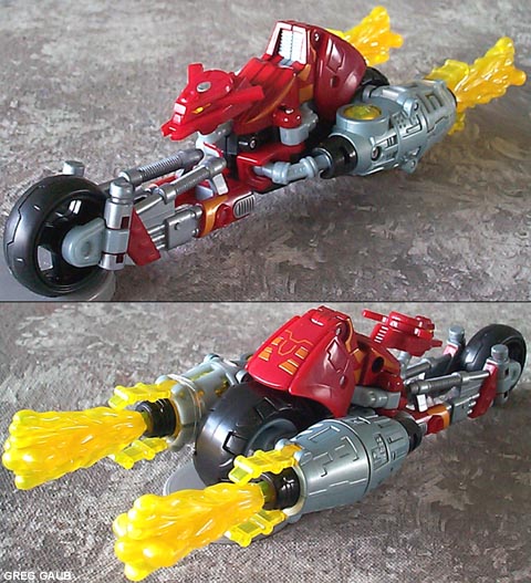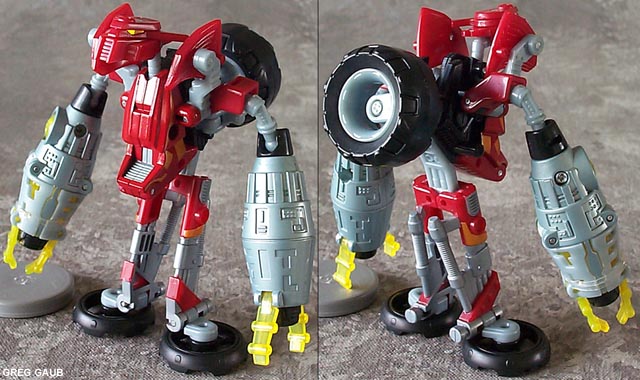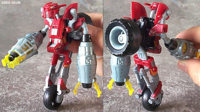 - He looks almost exactly like the show in his unicycle robot mode. His wheel can split much like the deluxe Thrust toy, which makes him able to stand on his own, but his legs are articulated, so posing is nigh impossible. Even though he has to be held to stand in robot mode (with a wheel instead of feet), that simply makes for show accurate play value. It's a lot more fun to zoom him around on a wheel than it is to make him waddle on his feet. His robot head is a dead ringer for the show as well. My main complaint is that his arms are too big. He's got serious Popeye syndrome, and the flaming projectile things only make it worse. In fact, with his projectiles inserted in the arms, he can use them as crutches in robot mode so that he can stand up.