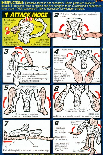 - His snake head section unfolds into his robot body and arms, and the snake tail/body slides and folds to become both his robot legs. It's a fairly simple transformation, with a little flipping and turning involved with the arms.