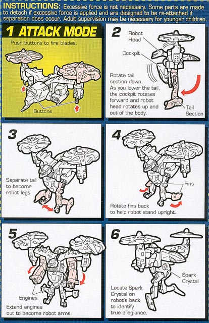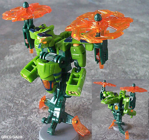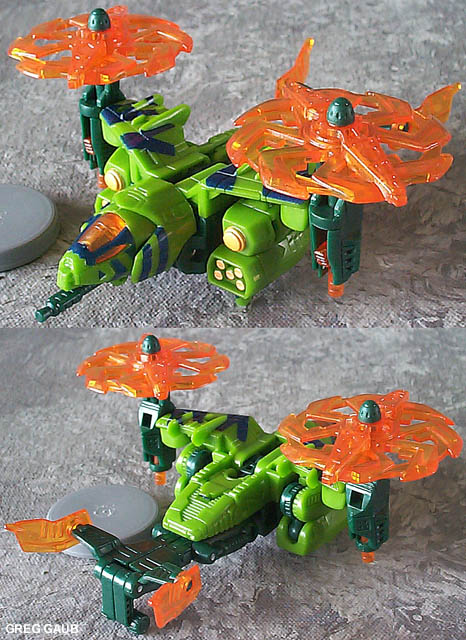 - Although the card says it's a helicopter, it's not. It's a VTOL (Vertical Take Off and Landing). This is because there are two propellers, one on each "wing," designed to rotate/tilt forward for flight. You can see how they can rotate in the Alt Mode picture above. I'm guessing they decided to call it a helicopter to prevent confusion among the kiddies. Anyway, it's a great VTOL toy. With the propellers removed, it looks very much like something out of Terminator or Aliens. Again, COOL vehicle mode!