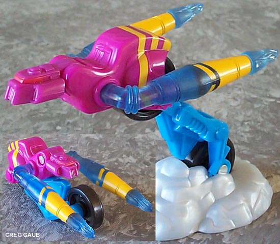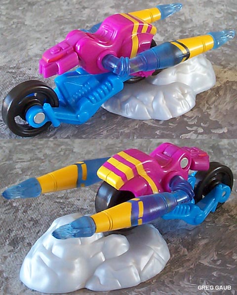 - The chassis is a sky blue, but the main body is fuchsia. He has black wheels, translucent blue arms/tailpipes and yellow accents on the arms and body. Except for the blue chassis, he's fairly close to the show and deluxe Thrust toy. He also has a gray plastic base that looks like peel out/tire smoke which hold him up in robot mode.