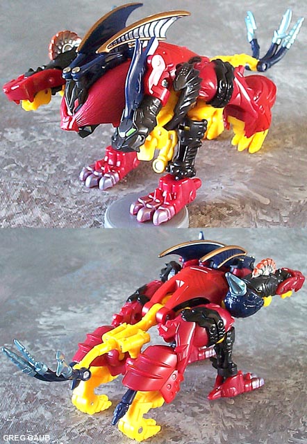 - A three-headed dog. As far as that goes, it's kind of cool. My only complaints about this mode are that the two heads on the sides are barely dog heads. They are much smaller than the middle head, and are almost unrecognizable as dog heads rather than bumps on his shoulders. His middle head also looks almost like a lion, but the long ears that resemble bat wings take care of that right away. As you can see in the photo, his right head has a spinning blade on top... no, it doesn't spin. :\ The "things in threes" that I mentioned above reappears in his tail, which has three ends, each with a different instrument of pain on the end. His tail also serves as a weapon in robot mode.