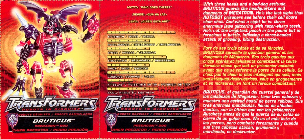 - In robot mode, well... he looks freaky. Freakier, even, than a three-headed dog turned into a robot would be expected to look. His two side dog heads become his robot arms and hands, and the center head transforms a little into the robot head. There are two other robot heads on his main robot head. Actually, they're more like faces on the sides of his head... very much like a Quintesson. His weapons, which are built-in, are blades of varying sorts. His legs are a little wide-stanced for my tastes. I think they could have made them fold in in some fashion. He has a huge torso, and a panel on his chest that opens to reveal... another panel? Yes, just some decoration. The folding panel serves no other functions as far as I can tell. Maybe they were going to cram a gimmick in there but pulled it at the last minute, because he has this very large torso that is completely empty and unused. I wish they had left whatever gimmick in there, because it probably would have made this toy cooler. Anyway, he also has a couple extra arms in this mode, as two of his dog legs fold up against his back, but can also be extended with built-in weapons, and made to be very ominous looking. Check out the photo above of him with four arms. One of the cool things I haven't mentioned yet are his shoulder pads in this mode. One is mostly just a piece of armor, the other has a huge spike sticking straight up out of it next to his head. The shoulder pads both get in the way of the huge ear-like things coming off of his main head, but those are hinged in two places, and can be positioned out of the way as you please.