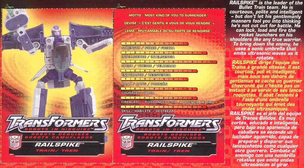 RAILSPIKE is the leader of the Bullet Train team. He is courteous, polite, and intelligent - but don't let his gentlemanly manners fool you into thinking he's not cut out for battle. He can lock, load and fire the rocket launchers on his shoulders like any true warrior. To bring down the enemy, he uses a sonic umbrella that emits ultrasonic waves as it rotates. |