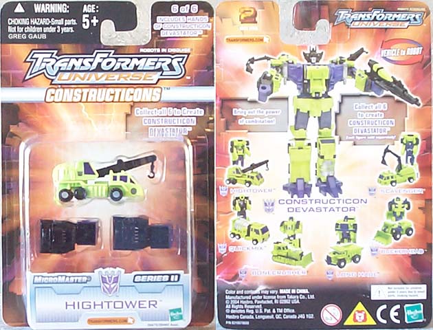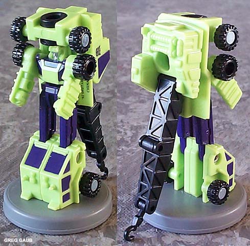 Greg's Review: Same review for all the Universe Devastator parts: These are Micromasters, plain and simple. The vehicle modes look pretty good. The transformations are really simple. The Robot modes are plain with limited articulation, and the green is a great neon Devastator green, as it should be. These toys are recolors of the Japanese Micromaster Sixbuilder and are well chosen and well done. |